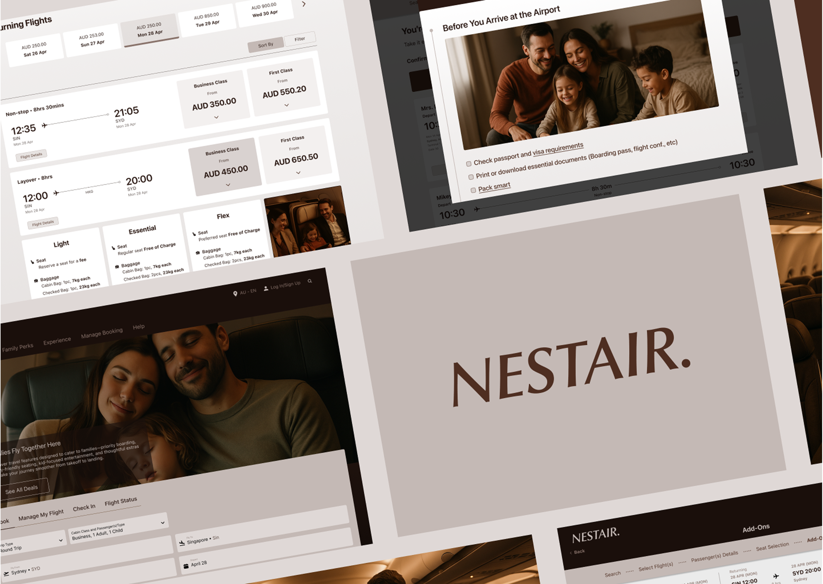 Nestair is a digital airline experience designed to support parents traveling with young children by reducing stress and creating a more seamless, family-friendly journey. This project was completed as part of a Master’s design unit at the University of Sydney.