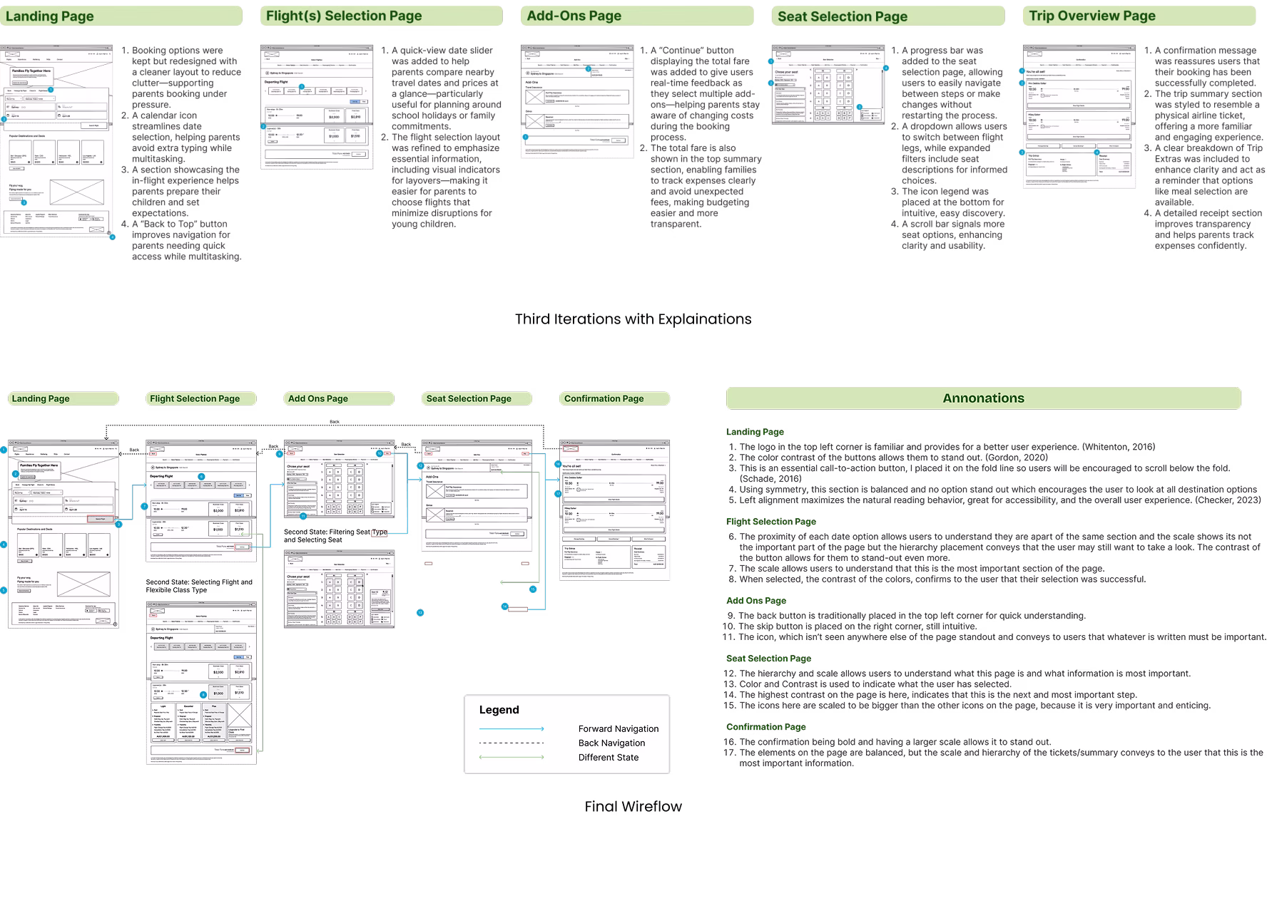Although formal user testing was not a required component of this project, I chose to conduct informal usability testing with a small group of friends and classmates. I asked each participant to interact with the prototype and walk through key user tasks, such as booking a flight with a child or locating family seating options.From these sessions, I gathered valuable feedback on areas such as:
